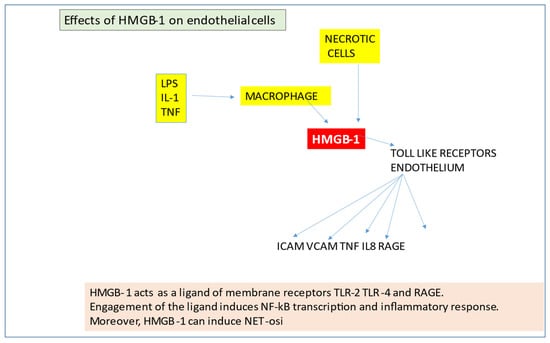 The protein high-mobility group B1 (HMGB-1) is an “alarmin” produced by monocytes and necrotic cells. It binds to DNA, promotes transcription and repair. HMGB-1 protein is also a potent Toll-like receptor activator. In such a way, HMGB-1 increases adhesion molecules’ expression and some inflammatory cytokines (TNF-α, MCP1, IL8) and receptors (RAGE), (Figure 6). Cytokines derived from the HMGB1-induced EC activation determine a further increase in HMGB-1, and, in this manner, an amplification of the inflammatory stimulus may be established.