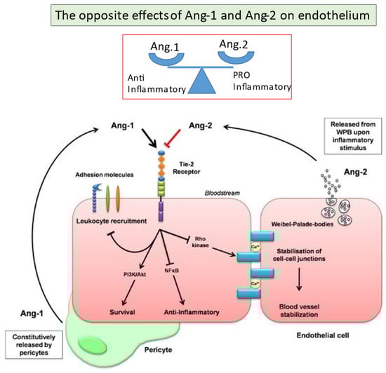 Apart from their effect on angiogenesis, the interplay between Ang-1 and Ang-2 has a pivotal role in the endothelial equilibrium among proinflammatory and anti-inflammatory states. The Tie-2 receptor keeps EC in a resting state, and it is maintained tonically activated by Ang-1.
