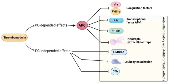 Thrombomodulin (TM) is a glycoprotein synthesized by endothelial cells and by other cells of mesodermal derivation. It has many actions that contribute to maintaining EC in an antithrombotic, anti-inflammatory state [104]. TM increases the activation rate of protein C (PC), and activated PC (APC) inhibits coagulative cascade (precisely by the inhibition of factor V-a and factor VIII-a). TM has other actions dependent on activated protein C. It detoxifies histones, interfering with neutrophil extracellular traps (NET) [105].