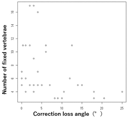 There was a weak but apparent negative correlation (R = −0.37) between the number of fixed vertebrae and the correction loss angle (p = 0.023).