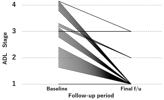 Figure 2 shows the ADL stage at the baseline and at the final follow-up. At the final follow-up, 20 patients improved by 1 stage, 8 patients improved by 2 stages, 8 patients improved by 3 stages, and 2 patients remained unchanged. There was no patient whose ADL stage worsened. At the final follow-up, the results showed that 33 patients were able to walk independently (stage 1), 3 patients were able to walk with assistance (stage 2), and 2 patients were able to sit independently (stage 3) (Figure 2).