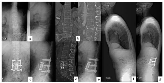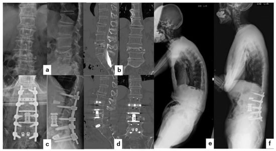 A seventy-five-year-old male had severe lower back pain and right lower leg pain, due to pseudoarthrosis at L4 after OVF. VBR was performed at L4 followed by two above–two below PLF at L2-S1 combined with L-LIF at L2/3 and L5/S1 posterior lumbar interbody fusion (PLIF). The surgical time was 413 min, and the blood loss was 964 g. No complications occurred during the perioperative period. The local kyphosis angle improved from 29° before surgery to −12° immediately after surgery and to −7° at the final follow-up. There was no cage subsidence and bone fusion was observed at one year after the surgery (Figure 4).