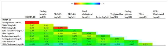 Correlogram representing the correlations between irisin levels and metabolic parameters. Abbreviations. HDL, high density lipoprotein cholesterol; FFAs, free fatty acids; HOMA-IR, homeostasis model of assessment of insulin resistance; PRO-C3, N-terminal type III collagen propeptide; PRO-C6, type VI collagen cleavage product.