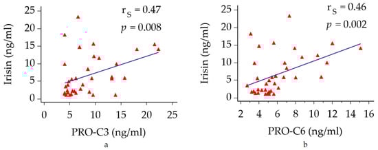 No significant correlation was found between irisin levels and both glucose and lipid profile. On the other hand, circulating irisin directly correlated with both PRO-C3 and PRO-C6 levels (rS = 0.47, p = 0.008 and rS = 0.46, p = 0.002, respectively) (Figure 2a,b).