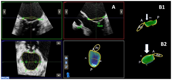 (A) Mitral valve quantification analysis: an example of MVQ analysis showing bi-commissural view (upper-left box), left ventricular outflow tract view (upper-right box), MV annulus in short axis (lower-left box) and 3D reconstruction of the MV annulus and leaflets (lower-right box). (B1) Three-dimensional (3D) reconstruction of the MV annulus and leaflets in D-MR patients, where the green area represents the tenting volume; (B2). Three-dimensional (3D) reconstruction of the MV annulus and leaflets in P-MR patients, where the green area represents the tenting volume, which is higher if compared with D-MR and labeled by a big white arrow.