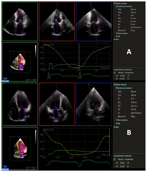 (A) Dynamic heart model analysis in D-MR patients, with LVEF of 35% and LVEDV of 205 mL. (B) Dynamic heart model analysis in P-MR patient with a severely dilated LV, LVEF of 27% and LVEDV of 480 mL.