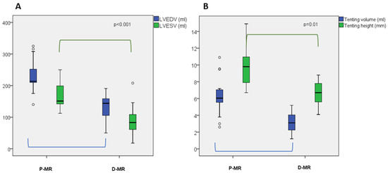 (A) Differences in mean LVEDV and LVESV between D-MR and P-MR patients, where p < 0.001 in both cases. (B) Differences in mean tenting height and tenting volume between D-MR and P-MR patients, where p = 0.01 in both cases. Box plots represent median, quartiles and extremes, and while circles represent the outliers.