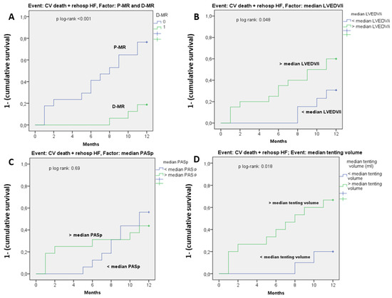 Survival analysis (Kaplan–Meier curves) for cardiovascular (CV) death and rehospitalization for HF. All curves show the 1-year event probability (expressed as 1—cumulative survival). (A) Factor: P-MR and D-MR status. (B) Factor: median value of LVEDV/I (mL/m2). (C) Factor: median value of PASp (mmHg) (D) Factor: median value of tenting volume (mL).
