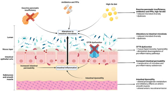Cystic fibrosis (CF) is a life-limiting multisystem autosomal recessive disease most commonly occurring in Caucasian populations [1,2,3,4]. CF is caused by mutations in the cystic fibrosis transmembrane conductance regulator (CFTR) gene, resulting in dysfunction of the CFTR protein. To date, over 2000 mutations have been identified in the Cystic Fibrosis Mutation Database (www.genet.sickkids.on.ca, accessed on 24 November 2021) [5,6,7,8]. While the burden of morbidity and mortality in CF is classically associated with pulmonary disease, CFTR dysfunction also has far-reaching extrapulmonary sequelae [8,9]. These include exocrine pancreatic insufficiency [10], pancreatitis [11,12], liver disease [13,14,15,16], CF-related diabetes [17,18], and male infertility [19,20]. With advances in targeted therapies, the life expectancy of people with CF has increased, but our understanding of the disease is incomplete and there is still no cure [3,4]. Moreover, people with CF now have improved nutritional and pulmonary outcomes and live well into adulthood [21,22,23]. Correspondingly, extrapulmonary complications, including gastrointestinal (GI) issues, have emerged as priorities [24]. In this article, we review two important manifestations of CF in the gastrointestinal tract, namely, intestinal inflammation and alterations in the gut microbiota, with a focus on the existing evidence, pathophysiology, and future research and therapeutic directions of these aspects.