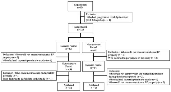 Of the 124 patients, we excluded those with progressive renal dysfunction (creatinine level ≥ 2.0 mg/dL) (n = 1) [19], those with inappropriate nocturnal BP recordings (n = 9), those who could not comply with the exercise instructions during the EX and/or non-EX period (n = 2), and those who declined to participate in the study (n = 15). Finally, 97 patients were included in the study population (53 men and 44 women; Figure 1).