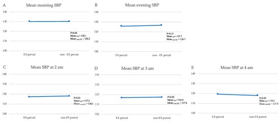 SBP at the non-EX period and the EX period (A) morning SBP (mmHg); (B) evening SBP (mmHg); (C) nocturnal SBP (mmHg) at 2:00 a.m.; (D) nocturnal SBP (mmHg) at 3:00 a.m.; (E) nocturnal SBP (mmHg) at 4:00 a.m.