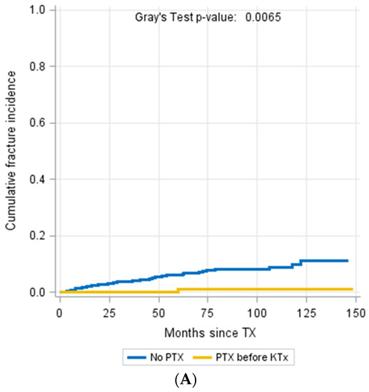 We analyzed the probability for fracture-free survival after KTx by Kaplan–Meier analysis and a log-rank test. To further, estimate the effect of PTX on the fracture incidence, we considered death as a competing risk. Cumulative incidence functions were estimated for both competing outcomes (death and fracture) and PTX groups were compared using Gray’s test.