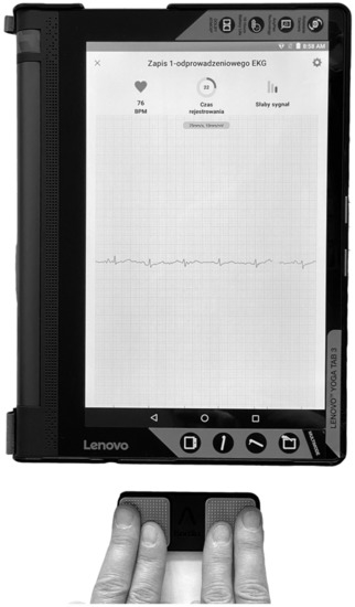Thirty-second single-lead ECG was recorded using KM portable device (AliveCor Inc, San Francisco, CA, USA) and compatible portable tablet computer (LenovoYT3-850L and Lenovo YT3-X50L, HK Limited, China) with AliveCor application (Figure 1). The KM device is FDA- and Conformité Européenne (CE)-approved, registers ECG on-demand, and works with iOS and Android devices. The KM pocket-sized pad consists of two metal electrodes. When they are touched by the right and left hands of the user, a bipolar lead I is created. The cardiac electric signal is converted into an ultrasound FM sound signal (18–24 kHz). The iOS or Android device application demodulates the sound signal to a digital ECG tracing (300 samples/s, 16-bit resolution). The ECG tracing can be viewed in real-time, and it is also stored [30]. Patients randomized to the study were provided with a tablet and the KM pad for three days. Patients were trained by the Neurology Department staff members on how to use the KM card and how to record ECG on tablet. The device was used repeatedly for intermittent screening. Patients were instructed to record ECG if any symptoms of AF appeared (palpitation, dyspnea, fatigue, chest tightness/pain, syncope/presyncope, and dizziness) and several times during the day (if possible, every 2–3 h) [31]. Further tuition following the initial guidance were offered to patients, who had problems with operation of the KM device. The lead-I ECG was interpreted by an algorithm and verified by a cardiologist. The application classifies an ECG as a sinus rhythm, possible AF, or unclassified. If the registration time was shorter than 30 s, the analysis was not performed. In some cases (poor quality recordings; too much interference in the recording), the algorithm was not able to analyze ECG, even if the time of registration exceeded 30 s (analysis was impossible).