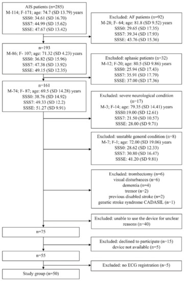AIS patients treated at the stroke unit were recruited over a period of 12 months. Fifty patients (26 males; 24 females; mean age 64.44, SD 10.52 years) from 285 AIS patients treated at the stroke unit Department of Neurology and Epileptology met the inclusion criteria, entered the study, and used the device properly—i.e., they were able to record at least one 30-s ECG (Figure 2, flow diagram).