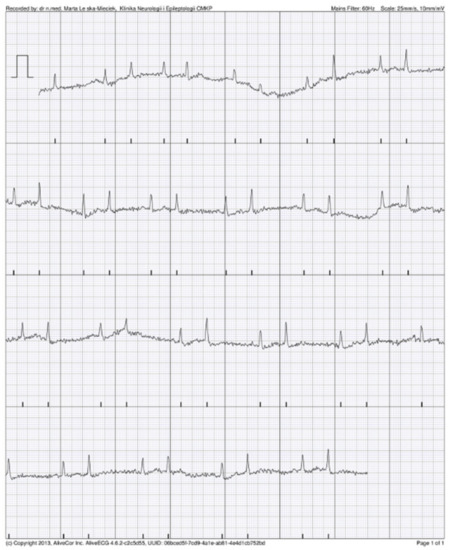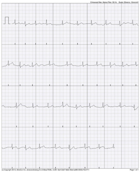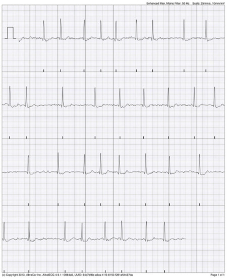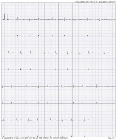 Upon review of the single-lead ECG, it was of adequate quality for rhythm decision in 95% (19/20) of ECG records documented by AliveCor algorithm as AF. The cardiologist confirmed the AF in one patient (1/50, 2% of study group; 1/285; 0.3% AIS patients; 1/193, 0.5% non-AF AIS patients) in five KM ECG records (Figure 3). The rest of ECG records documented by AliveCor algorithm as AF were interpreted by cardiologist as supraventricular extrasystoles in three patients in a total of seven KM ECG records (Figure 4). In three patients (seven KM ECG records), the diagnosis of AF was not confirmed by a cardiologist (Figure 5). One KM ECG record interpreted by algorithm as AF was evaluated by a cardiologist as undiagnosed, although AF was a possibility (Figure 6). The data regarding cardiologist’s analysis and 24 h Holter ECG are summarized in Table 2. Sensitivity and specificity of KM for AF were 100% (95% CI 47.8–100%) and 98.3% (95% CI 97.2–99.0%), respectively.