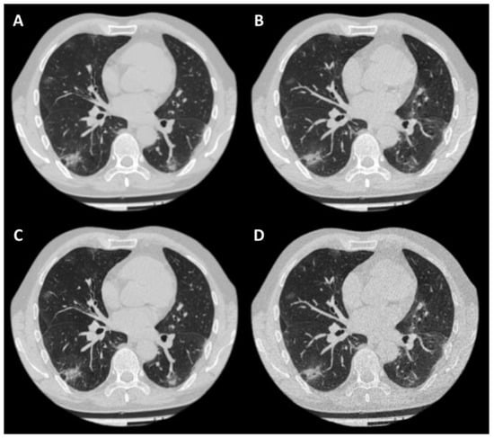 Example of a case in four reconstructions. Patient: 57-year-old male, BMI = 24.05 kg/m2; (A)—CT soft; (B)—LDCT soft; (C)—CT sharp; (D)—LDCT sharp. CTDIvol for CT was 15.5 mGy, for LDCT—3.4 mGy. The effective dose for standard CT was 10.31 mSv, for LDCT—2.46 mSv.