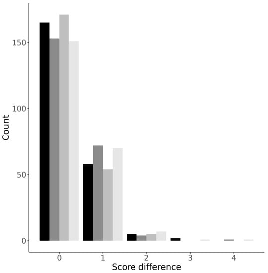 To further evaluate the inter-rater agreement, we studied the differences between the CT0-4 grades assigned by the readers. For all four protocols, the difference distribution was non-normal with positive kurtosis. Most differences (69.6 ± 4.2%) were zero, while 27.6 ± 3.8%, 2.3 ± 0.5%, 0.4 ± 0.6%, and 0.2 ± 0.3% of assessments differed by one, two, three, and four grades, respectively (Figure 3).