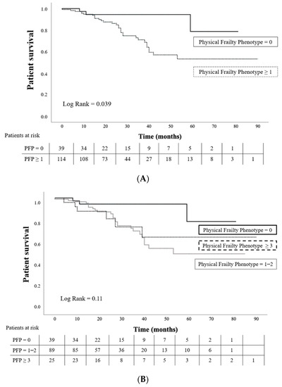 The univariate analysis of patient mortality while listed (n = 153) according to PFP score at the time of inclusion showed that robust patients had lower mortality (7.7 vs. 27.2% if PFP ≥ 1, p = 0.039, Figure 1A), although this difference lost its statistical significance when the three categories were considered (Figure 1B). In contrast, the FRAIL scale failed to detect this difference with both two and three categories (Figure 1C,D). When an adjusted multivariable Cox analysis was performed, only age (HR 1.098 per year) and cardiovascular disease (HR 3.43 if any cardiovascular disease was present) were associated with patient mortality. PFP ≥ 1 almost reached statistical significance for higher risk of mortality (HR 4.07, p = 0.09) (Table 4).