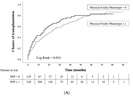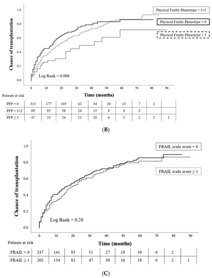 3.4. Chance of Transplantation among KT Candidates and Its Relationship with Frailty Status