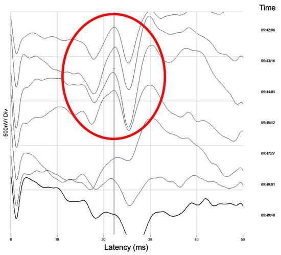 Neurophysiological monitoring during the intervention (IINM). Sudden changes in the evoked potentials as an indication of an M2 occlusion of the middle cerebral artery. These changes occurred after balloon deflation and a resulting coil protrusion.