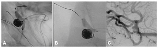 - Cai, K.; Zhang, Y.; Shen, L.; Ni, Y.; Ji, Q. Comparison of Stent-Assisted Coiling and Balloon-Assisted Coiling in the Treatment of Ruptured Wide-Necked Intracranial Aneurysms in the Acute Period. World Neurosurg. 2016, 96, 316–321. [Google Scholar] [CrossRef] [PubMed]
