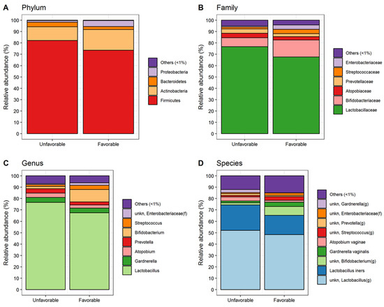 Cervical swab microbiota composition (i.e., mean relative abundance %) at phylum (A), family (B), genus (C) and species (D) levels in patients with unfavorable and favorable pregnancy outcome. All bacteria with mean relative abundance less than 1% are included in the “Others (<1%)” category.