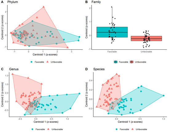 Scatter plots of the Z-scores computed within each cluster (i.e., centroid) detected by PEnalized LOgistic Regression Analysis at phylum (A), genus (C) and species (D). Each point represents the Z-scores pair computed at each individual and were filled with red and blue colors to denote patients with unfavorable and favorable pregnancy outcomes, respectively. Moreover, a polygon connecting the outermost data points is shown for each group. As a single cluster of bacteria population was detected at family level (B), the box plot was shown (instead of a scatter plot).