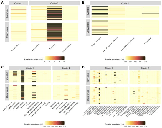 Specifically, patients with an unfavorable outcome are characterized by lower Z-scores from cluster 1 and higher Z-scores from cluster 2, whereas, on the contrary, those with a favorable outcome are characterized by higher Z-scores from cluster 1 and lower Z-scores from cluster 2. Because of the presence of a single cluster in the family level, it was quite clear that the centroid’s Z-scores detected within patients with unfavorable outcome were significantly lower than the ones with the favorable one. Moreover, Heatmaps reported in Figure 3 show the relative abundance of each of the microorganisms detected within each cluster at the phylum (A), family (B), genus (C) and species (D) level for each recruited subject in the unfavorable and favorable groups, respectively.