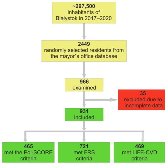 A total of 2449 residents were randomly selected from the mayor’s office database and were invited to participate in the study. A total of966 residents responded and were examined (Figure 2). Due to incomplete data, 35 people were excluded from further analysis. Overall, 931 individuals were included in the research group, out of which 63 (6.8%) participants had established CVD, 275 (29.6%) had a history of AH, 71 (7.6%) had a history of diabetes mellitus (DM), and 186 (20.1%) smoked cigarettes.