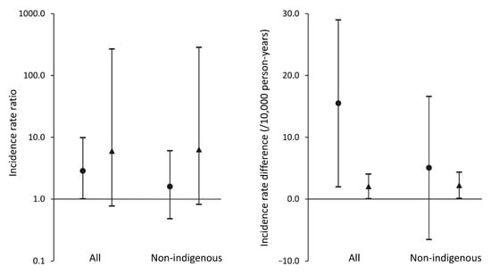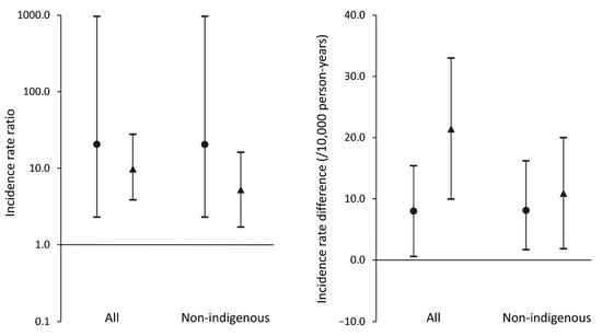 Incidence rate ratios (IRRs) and incidence rate differences (IRDs) for renal replacement therapy (RRT) in participants from the Fremantle Diabetes Study Phase 1 (FDS1) versus those in participants from Phase 2 (FDS2) with type 2 diabetes (●) and without known diabetes (▲) from the FDS catchment area. Data are IRR (left panel) and IRD (right panel) with 95% confidence intervals (vertical bars) for all participants and those who were not of Aboriginal ethnic origin.