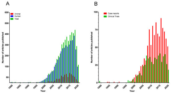 Result of PubMed searches of (A) number of articles published related to “deep brain stimulation (DBS)” in animal studies (red), human studies (blue), and both (green) and (B) number of case reports on DBS (red) and clinical trials (as defined by the PubMed filters) (green).
