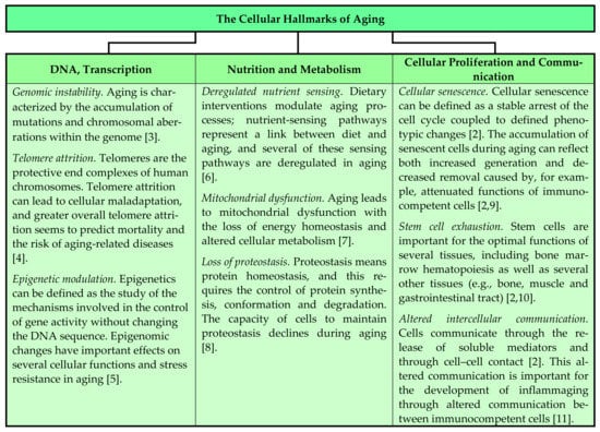 The complex process of aging is characterized by the modulation of fundamental cellular processes, and this is reflected in the previously described nine hallmarks of aging, which include genomic instability, telomere attrition, epigenetic alterations, loss of proteostasis, deregulated nutrient sensing, mitochondrial dysfunction, cellular senescence, stem cell exhaustion and altered intercellular communication (Figure 1) [2,3,4,5,6,7,8,9,10,11]. These cellular effects lead to aging-dependent alterations in organs and tissues, including hematopoietic cells together with their supporting stromal cells in the common bone marrow microenvironment, as well as various immunocompetent cell subsets with the modulation of their immunoregulatory interactions [2,12,13,14,15,16]. Aging can thus alter the regulation of both hematopoiesis and inflammation [12]. In this context we describe and discuss the effects of aging on normal hematopoiesis together with the occurrence of anemia and increased C-reactive protein (CRP) levels in elderly individuals. We would expect the frequency and causes of anemia to differ between developed and underdeveloped countries; we therefore emphasize that the present review is mainly based on studies in developed countries.