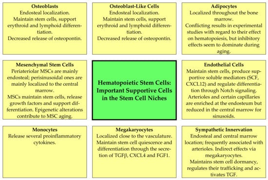 Table 2. Extrinsic mechanisms for the aging of normal hematopoiesis: a summarizing overview of important mechanisms behind the contribution of various stromal cells to the aging of normal hematopoiesis (for additional information, see the more detailed review/discussion with corresponding references for each cell type in Section 2.3). - Osteoblasts and other osteolineage cells. Osteoblasts are the predominant bone-lining endosteal cells [54], whereas osteolineage or osteoblastic lineage cells refer to the intermediate stages of differentiation in the direction from MSCs towards osteoblasts [57]. These cells and particularly mature osteoblasts seem to be the most important for the maintenance of more committed progenitors, especially lymphoid cells [62,63]. They stimulate/regulate hematopoiesis both through cell–cell contact (e.g., expression of the Notch ligand Jagged1) and through the release of soluble mediators (e.g., the growth factors CXCL12, stem cell factor and angiopoietin 1; osteopontin) [17]. Aging causes a decrease in the number of osteoblasts and in addition decreases osteopontin release via these aging cells (Figure 2, Table 2) [19,55,62,63]. As described above, aging MSCs favor adipogenic differentiation [59], and a reduction in osteoblasts is then caused by several mechanisms, including the induction of apoptosis, the increased release of reactive oxygen species, decreased glutathione reductase activity and the increased phosphorylation of p53 and p66 [64]. Finally, animal models suggest that a reduction in/lack of osteopontin causes decreased engraftment capacity but increases long-term stem cell frequency together with loss of stem cell polarity; as would then be expected from these observations, thrombin-activated osteopontin attenuates the aging stem cell phenotype [55].