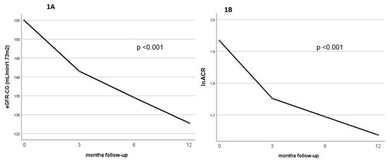 The estimated GFR decreased from 155.9 ± 36.3 to 127.7 ± 27.4 mL/min/1.73 m2 (p < 0.001), reflecting the hyperfiltration that characterizes patients with severe obesity. In addition, the albuminuria, as measured by the log-transformed albumin-creatinine ratio (lnACR), decreased from 1.85 ± 1.08 to 1.56 ± 0.73 (p = 0.056). Both the estimated GFR (Figure 1A) and the albuminuria (Figure 1B) experienced a progressive decrease from baseline to the final observation 12 months after BS at all follow-up times (p for trend <0.001 for both).