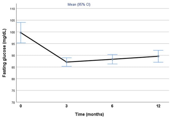 The changes in fasting glucose from baseline (before BS) to 12-months of follow-up, with mid-points at 3 and 6 months. Values of fasting glucose are given as the mean and corresponding 95% confidence intervals.
