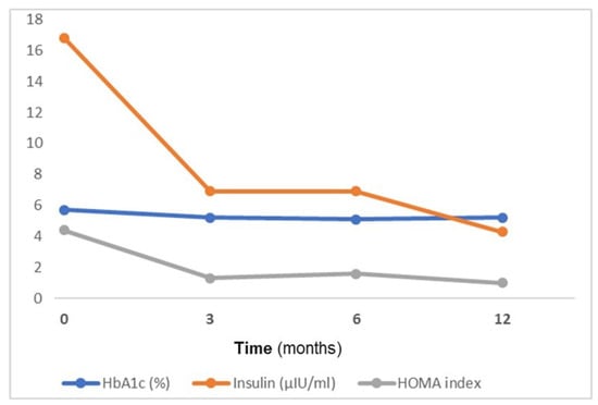 Figure 3 shows the overall mean of glycosylated hemoglobin, fasting insulin and HOMA-IR (homeostasis model assessment-estimated insulin resistance index) before BS (0 months) and at 3, 6 and 12 months of follow-up. There is a statistically significant decrease of these three parameters throughout the first year of follow-up (p for trend < 0.001 for all).