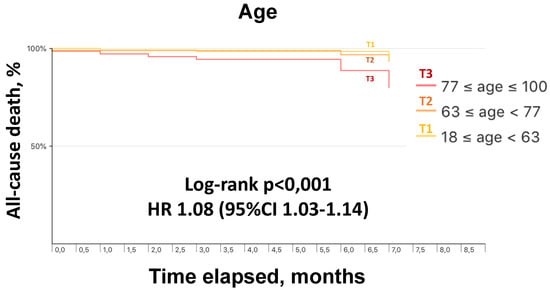 The mean follow-up duration was 6 ± 2 months. Follow-up data were obtained in all patients. The incidence of all-cause death during follow-up was 4.7% (14 events) (Table 2). As compared with survivors, deceased patients were significantly older; had a higher prevalence of peripheral artery disease and atrial fibrillation; during the index hospitalization, suffered more frequently from acute heart failure and ischemic stroke, and showed higher neutrophil-to-lymphocyte ratio and lower estimated glomerular filtration rate; had increased prevalence of left bundle branch block; presented a greater use of beta-blockers, diuretic agents, and oral anticoagulant therapy (Table 1). Length of stay during index hospitalization was similar in survivors and deceased patients (13 ± 9 vs. 14 ± 10 days; p = 0.61). At univariate analysis, age, in-hospital acute heart failure, QRS duration at baseline electrocardiogram, and in-hospital use of beta-blockers were associated with higher mortality during follow-up (Table 3). After adjustment, age remained the only independent predictor of all-cause death (aHR 1.08; 95% CI 1.01–1.16) (Table 3). Figure 1 shows survival curves at 6 months according to tertiles of age.