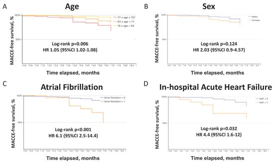 Kaplan–Meier curves showing MACCE-free survival at 6 months by tertiles of age (A), sex (B), atrial fibrillation status (C), and occurrence of acute heart failure during index hospitalization for COVID-19 (D). COVID-19, coronavirus disease 2019; MACCE, major adverse cardiac and cerebrovascular events.