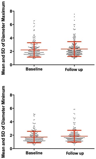 Mean and standard deviation (SD) of diameters (mm) at baseline and follow-up.
