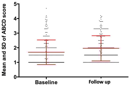 Mean and standard deviation (SD) of ABCD Score at baseline and follow-up.