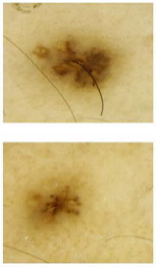 Example of nevi change in experimental group subject at T0 (lower) and T1 (upper), showing expansion of diameters and presence of multiple pigmented globules located on the periphery of the lesion, indicating the growth of the lesion. The change in color can be attributed to the migration of the melanocytic elements from deep to superficial planes, or vice versa.