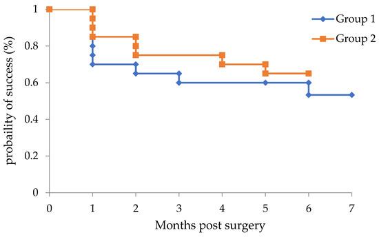 Figure 2 shows the Kaplan–Meier survival curves used to compare the surgical outcomes between Groups 1 and 2. The success rates in Groups 1 and 2 were 53.3% and 65.0%, respectively (p = 0.54).