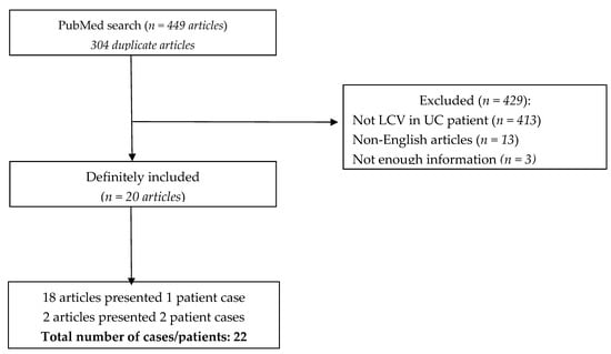 PRISMA flow chart: In order to be included, all cases reviewed had to report biopsy of the skin and colonic mucosa, with pathohistological descriptions consistent with the diagnosis of LCV and UC. Cases in which skin biopsy specimen was missing were included only if clinical presentation and clinical course were highly suggestive of the diagnosis of LCV in UC, and all co-authors independently agreed upon that matter.