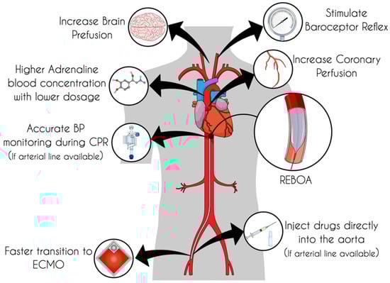 Recently, a nice review by Nowadly et al. [] gathered all the evidence regarding the use of REBOA as a new technique in NTCA, also exploring the salient physiological aspects. Several key points emerged from this work; we will review these aspects below, adding new possible effects that aortic occlusion can have to promote ROSC. The potential physiological effects and logistical advantages due to this technique are represented schematically in Figure 1.