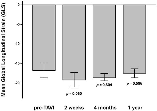 Mean Global Longitudinal Strain (GLS) at multiple study time points. p values reported on each bar refer to comparisons with pre-TAVI values.