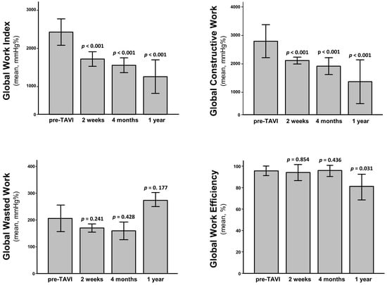 Mean MW indices at multiple study time points: Global Work Index (upper left), Global Constructive Work (upper right), Global Wasted Work (lower left), and Global Work Efficiency (lower right). p values reported on each bar refer to comparisons with pre-TAVI values. Not statistically significant after adjustment for repeated measures and multiple comparison.
