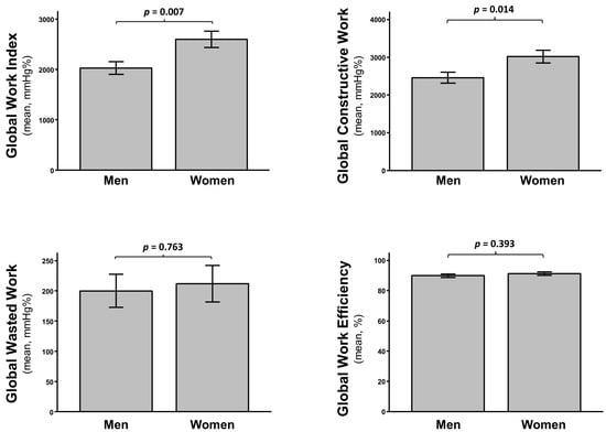 Mean baseline MW indices in gender subgroups: Global Work Index (upper left), Global Constructive Work (upper right), Global Wasted Work (lower left), and Global Work Efficiency (lower right).