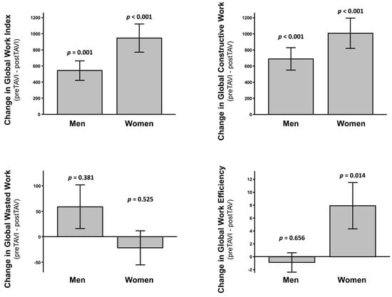 Despite no difference in mean LVEF (p = 0.417) nor in GLS (p = 0.142) (Supplementary Figure S2), women had higher GWI (p = 0.007) and GCW (p = 0.014) compared to men (Figure 3), with no difference in GWW (p = 0.763) nor in GWE (p = 0.393) at baseline. The delta change of GCW after TAVI was larger in women, although it remained significant in both sex groups (p = 0.001 in men; p < 0.001 in women). A similar effect was found for GCW (p < 0.001 in both groups), while a significant delta change in GWE was measured in women (p = 0.014), but not in men (p = 0.656). No significant delta change was observed in either group for GWW (Figure 4). These results were maintained after adjustment for multiple comparison.