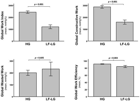 Comparison of mean baseline MW indices between patients with normal high gradient severe aortic stenosis (HG) and low flow/low gradient severe aortic stenosis (LF-LG): Global Work Index (upper left), Global Constructive Work (upper right), Global Wasted Work (lower left), and Global Work Efficiency (lower right).