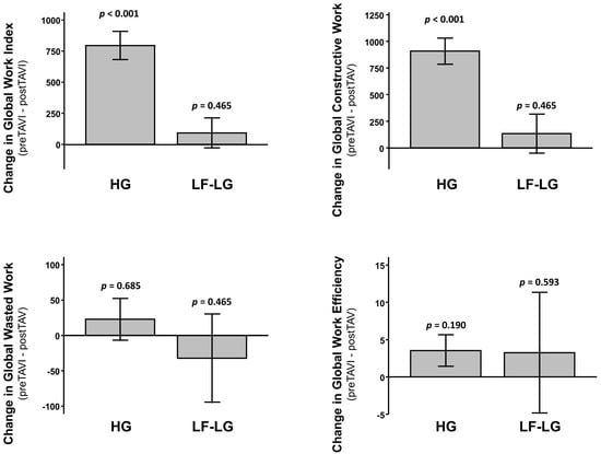 Delta change in MW indices between patients with normal high gradient severe aortic stenosis (HG) and low flow/low gradient severe aortic stenosis (LF-LG): Global Work Index (upper left), Global Constructive Work (upper right), Global Wasted Work (lower left), and Global Work Efficiency (lower right).